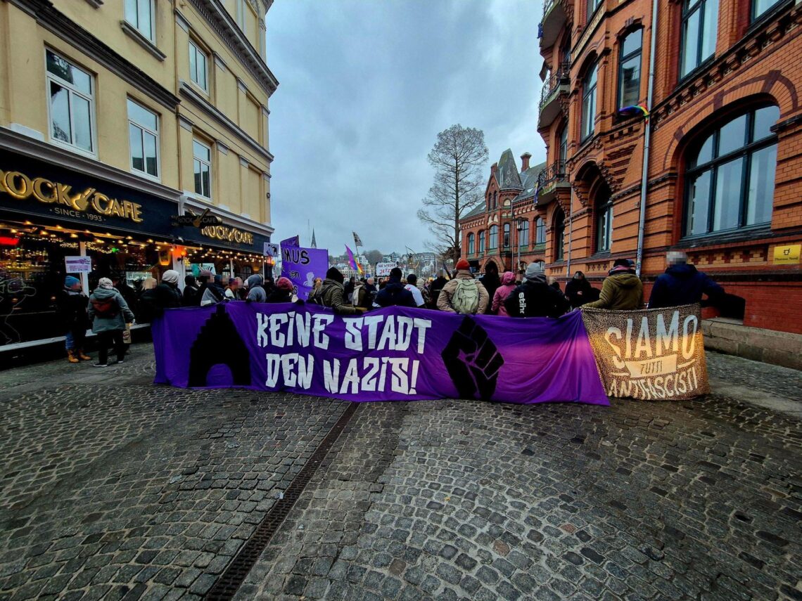 Trotz eisiger Temperaturen schlossen sich am Samstag, den 24.01.26, bis zu 1.000 Menschen den Protesten gegen einen AfD-Stand in der Flensburger Innenstadt an. Dabei ist ihnen Widerstand von allen Seiten gelungen – mehrere Kundgebungen rund um den Nordermarkt beschallten den AfD-Stand stundenlang mit dem „Scheiß AfD“ – Song, laute Sprechchöre waren über den gesamten Nordermarkt zu hören und es gab mehrere (teilweise) erfolgreiche Störversuche von Anfaschist:innen.