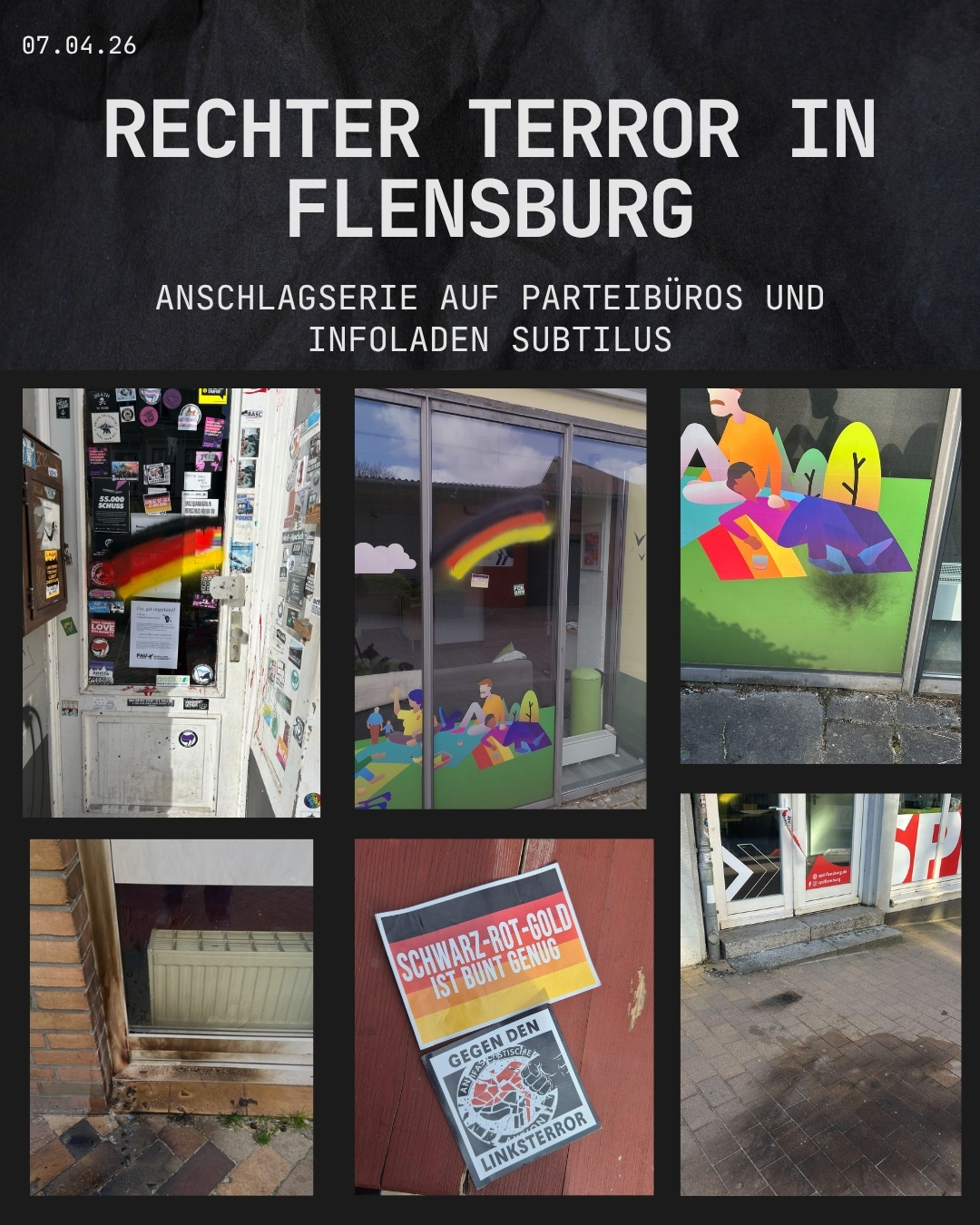 Am Morgen des 6.4.2026 wurden am Infoladen Subtilus schwarz-rot-goldene Sprühereien und rechte Aufkleber entdeckt. In der Norderstraße war die selbe Schmiererei über ein altes Plakat, das gegen den AfD Stand am 24.1.2026 mobilisierte, gesprayt. Zur selben Zeit wurden an den Parteibüros von Die Linke, SSW, Grüne, SPD und CDU die selben Schmierereien entdeckt. Auf die Parteibüros von Linken und Grünen sind zudem mit Benzin gefüllte aber ungezündete Molotow-Cocktails geflogen.